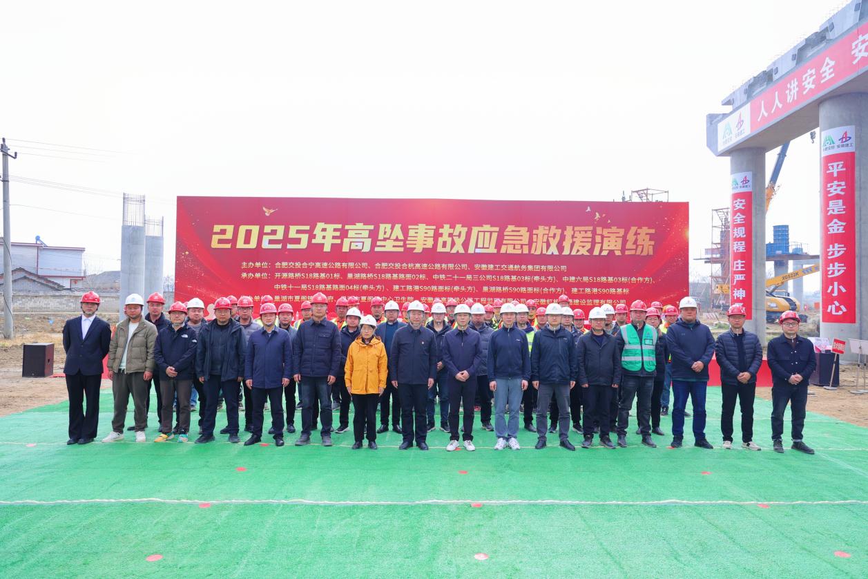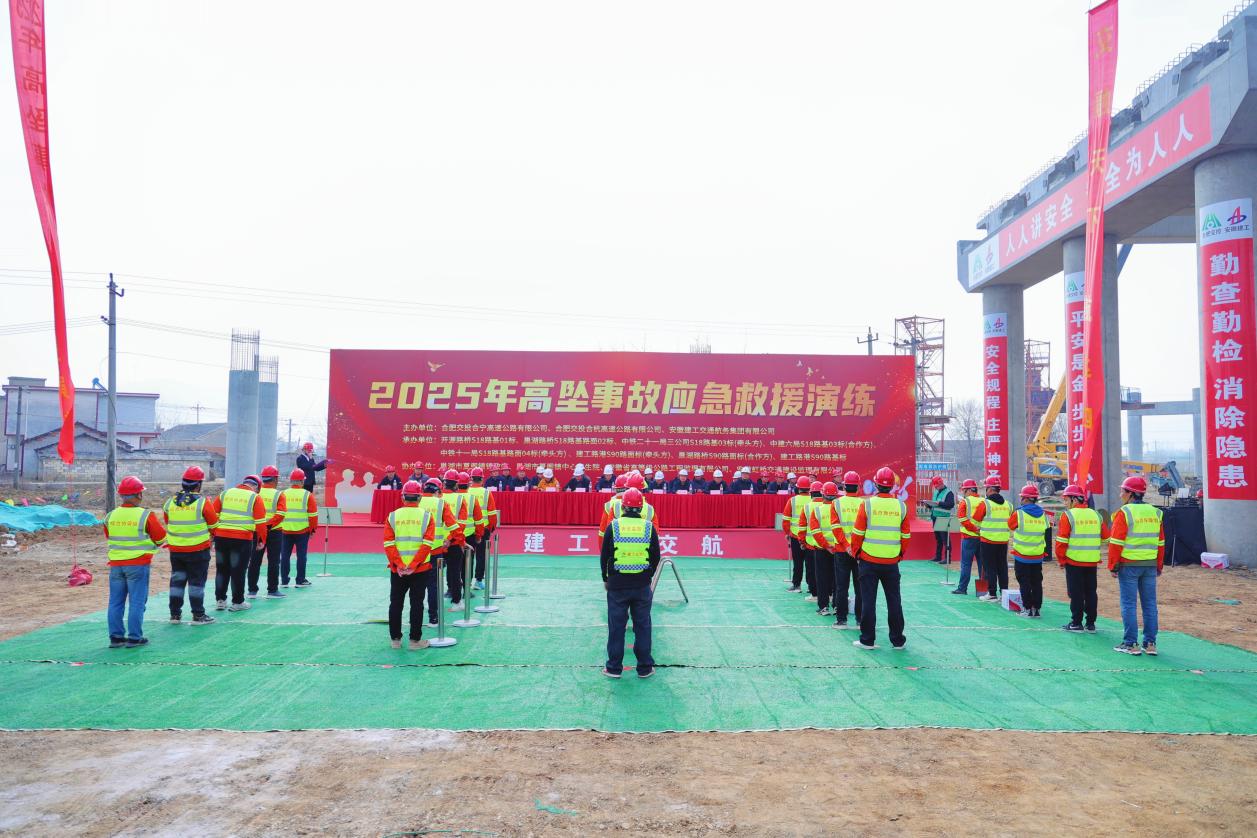 2 月 28 日上午,巢湖市夏閣鎮 S328 省道交蕪合高速夏閣東樞紐現澆支架 E 匝道處,一場實戰化的高處墜落事故應急救援演練拉開帷幕。此次演練由合肥交投合寧高速公路有限公司、合肥交投合杭高速公路有限公司、安徽建工交通航務集團有限公司主辦,建工交航黨委委員、副總經理邢磊,安全環保監察部部長朱云珍參加演練活動,并發表致辭與點評。