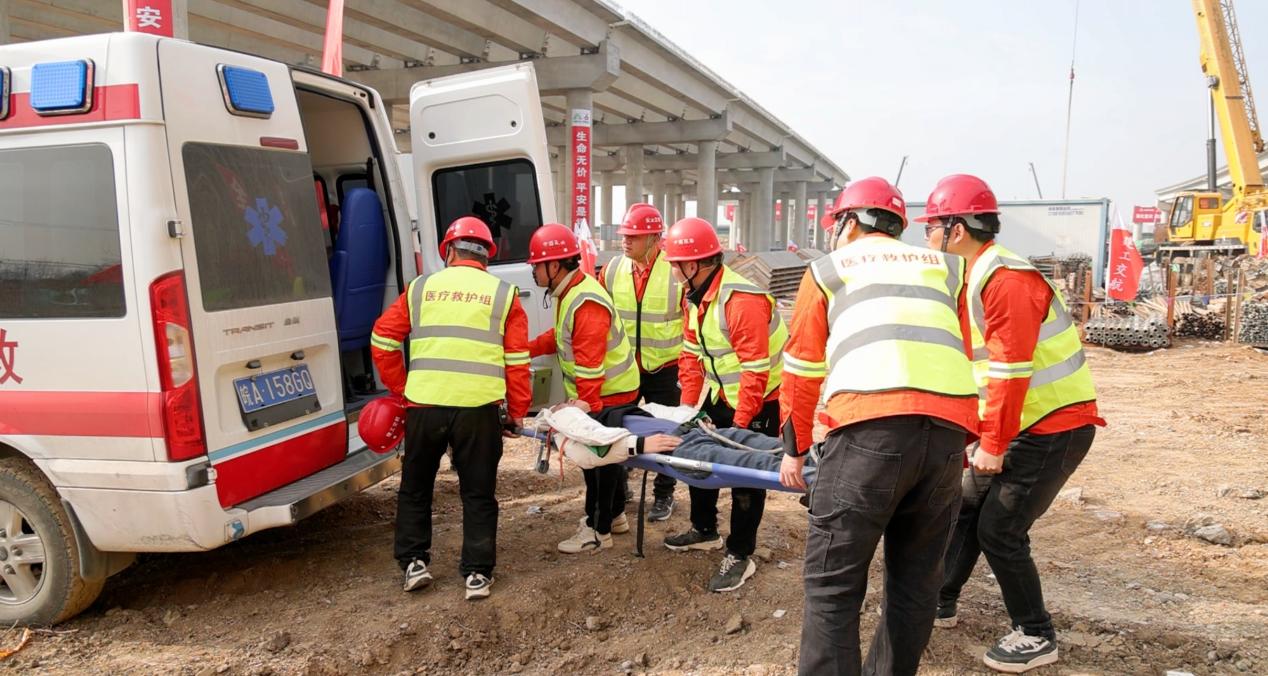 本次演練模擬了在夏閣東樞紐 E 匝道現澆梁支架拆除施工時,一名工人因未妥善系掛安全帶,失足從支架墜落至地面受傷的場景,全面檢驗應急預案實效性。