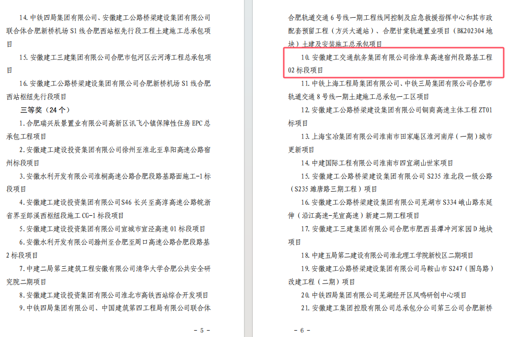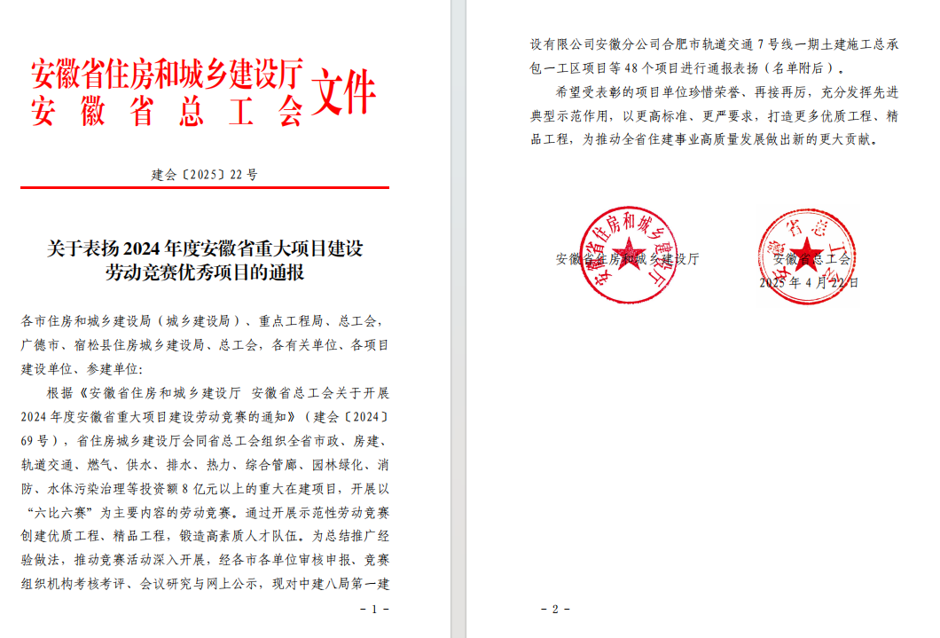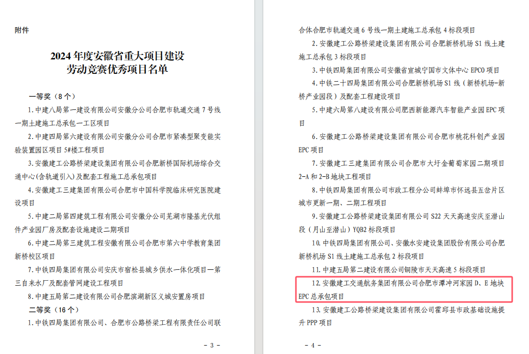 近日,安徽省住房和城鄉建設廳、安徽省總工會聯合發布《關于表揚 2024 年度安徽省重大項目建設勞動競賽優秀項目的通報》,公司潭沖河家園 D、E 地塊 EPC 總承包項目和徐淮阜高速宿州段路基工程 02 標項目表現突出,成功入選優秀項目名單。