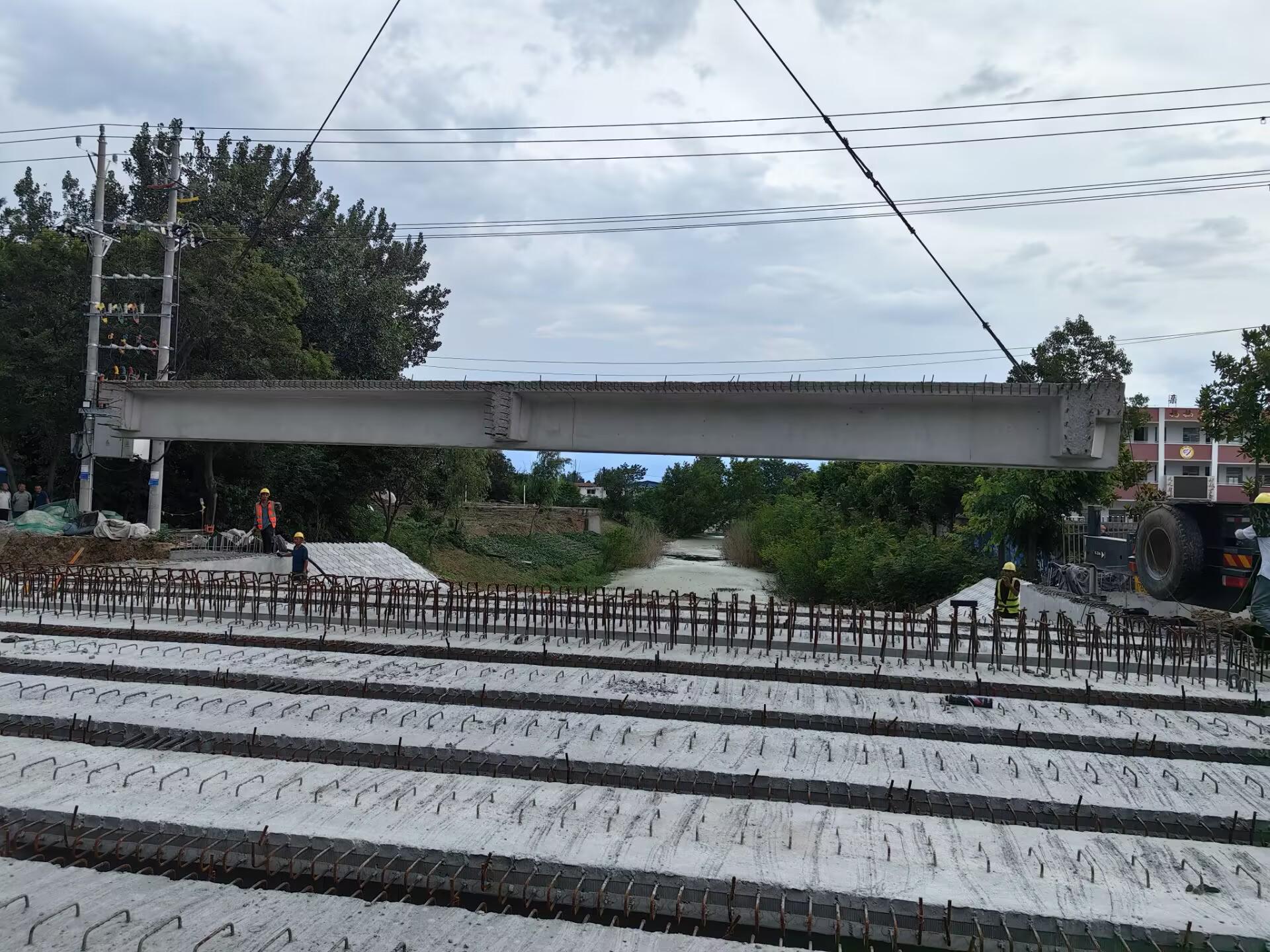 本次架設的16米預應力混凝土T梁采用“工廠預制+精準架設”模式。針對施工路段臨近學校、交通壓力大的情況,項目部提前部署交通管控方案,保障了吊裝作業的順利進行。