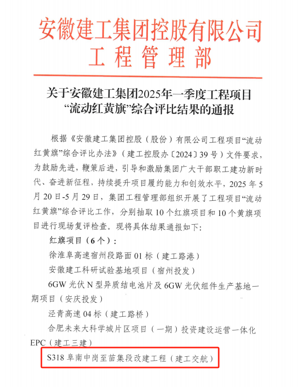 近日,安徽建工集團(tuán)公布2025年一季度工程項(xiàng)目“流動(dòng)紅黃旗"評(píng)比結(jié)果,建工交航市政工程公司(王家壩建投)承建的S318阜南中崗至苗集段改建工程獲評(píng)“紅旗項(xiàng)目”。