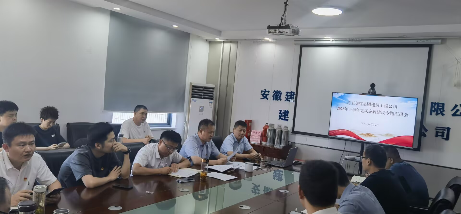 8 月 15 日下午,建筑工程公司以 “現場 + 視頻” 形式,在五樓會議室召開 2025 年上半年黨風廉政建設專題匯報會,公司領導班子成員、部門負責人、項目經理和全體黨員參會。