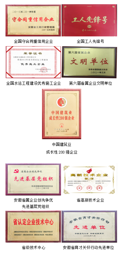 安徽省交通航務(wù)工程有限公司是安徽建工集團(tuán)旗下骨干成員企業(yè),系安徽省首家市政特級(jí)資質(zhì)企業(yè),已同集團(tuán)公司整體上市(股票代碼:600502),注冊(cè)資本10億元,擁有建筑裝修裝飾工程、古建筑工程、河湖整治工程、環(huán)保工程、地基基礎(chǔ)工程、電子與智能化工程、橋梁工程、隧道工程8項(xiàng)壹級(jí)專業(yè)承包資質(zhì),以及建筑工程施工、公路工程施工、港口與航道工程施工、機(jī)電工程施工4項(xiàng)壹級(jí)總承包資質(zhì),具備港口與航道工程、公路工程、水利水電工程、礦山工程、鋼結(jié)構(gòu)、地質(zhì)災(zāi)害處理、河湖整治等施工能力。近年來,公司先后獲評(píng)全國(guó)“重合同、守信用”企業(yè)、中國(guó)建筑業(yè)競(jìng)爭(zhēng)性百強(qiáng)企業(yè)、全國(guó)水運(yùn)優(yōu)秀施工企業(yè)、省高新技術(shù)企業(yè)、第六屆省屬企業(yè)文明單位等殊榮,連續(xù)多年獲評(píng)“全國(guó)工人先鋒號(hào)”,擁有1個(gè)院士科研工作基地、1個(gè)省級(jí)企業(yè)技術(shù)中心、1個(gè)省級(jí)科技研發(fā)中心,近2年累計(jì)發(fā)明專利10項(xiàng)、省部級(jí)工法15項(xiàng)、實(shí)用新型專利20項(xiàng)。